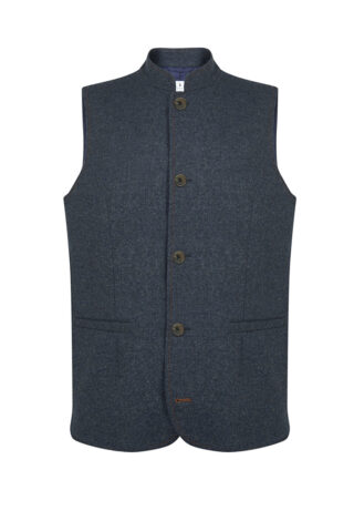 Ladies Shooting Nehru Gilet – Indigo Tweed with Ginger Brown Pop – Made in England